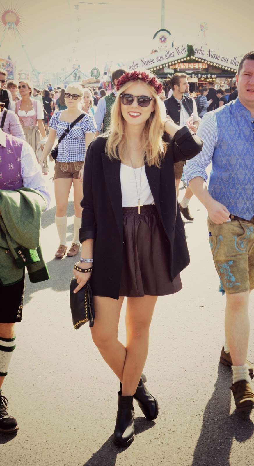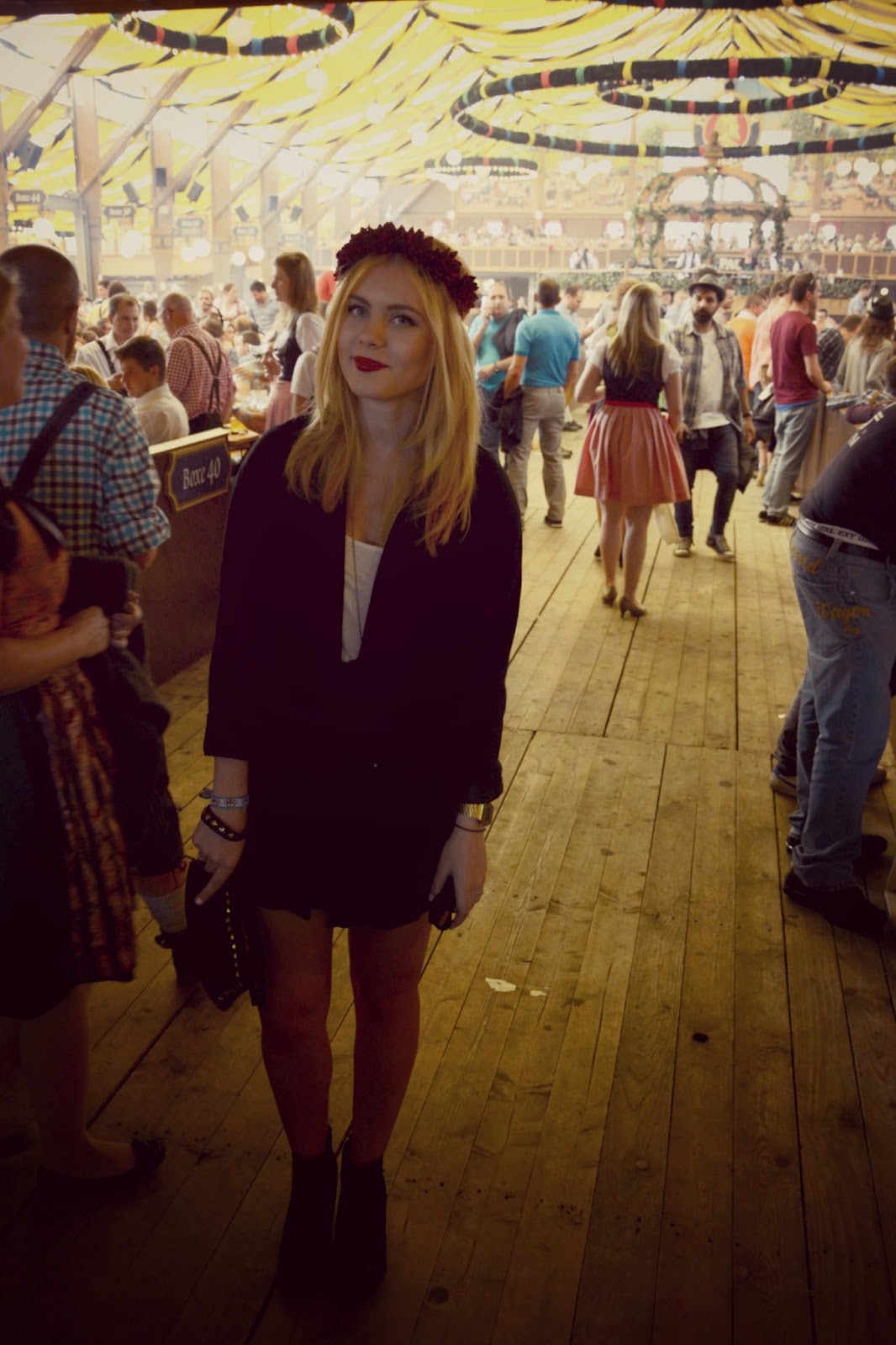 Für alle, die nicht aus Bayern kommen und noch nie auf dem Oktoberfest waren wird das erste Mal auf der Theresienwiese wahrscheinlich erstmal ein Schock, so viele Betrunkene und Staatsangehörigkeiten auf so wenig Platz.Klar, ein, zwei Maß trinken gehört natürlich dazu, auch wenn ich eher zu der Sorte gehöre, die lieber einen Liter Limo als einen Liter Bier trinkt, aber so übertreiben muss man es ja auch nicht. Das ist das einzige, was mich an der Wiesn ein bisschen stört, ansonsten: ich bin begeistert. Selten hat man solch eine Möglichkeit, so viele Menschen aus so unterschiedlichen Ländern kennenzulernen. Auch wenn das Essen & Trinken etwas überteuert sind (die Maß dieses Jahr im Schnitt 10€), es ist doch wirklich gut und einfach typisch bayrisch. Also für alle, die noch nie auf der Wiesn warn: traut euch! Es lohnt sich, wirklich! Wenn ihr euch jetzt die Bilder von meinem Wiesn-Tag anschauen werdet, ja, ihr werdet feststellen, dass ich gar keine Tracht trage. Das kommt aber nicht daher, dass ich kein Dirndl besitze (wie bereits erwähnt besitze ich mittlerweile sogar zwei :)), aber mein Freund war leider etwas erkältet und wollte nicht noch kränker werden und hat sich dazu entschlossen, heute mal nicht in Tracht zu gehen. Und so wollte ich ihn natürlich auch nicht alleine rumlaufen lassen, also haben wir beide beschlossen einfach mal ganz normal aufs Oktoberfest zu gehen, auch wenn die Blicke der anderen Gäste Bände gesprochen haben, frei nach dem Motto: passt ja gar nicht! Aber uns war das egal, außerdem konnte ich endlich mal meinen neuen Kunstlederrock in Bordeaux von forever21 tragen. Jetzt wünsche ich euch noch einen schönen Rest-Sonntag.