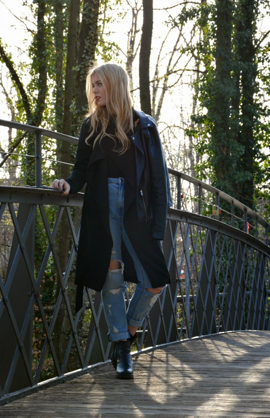 Wer sich jetzt fragt: hä, wer schreibt denn hier? Ja, ich lebe noch. Es war eine relativ lange Blogpause von fast 2 Wochen, i’m so sorry. Ich war viel unterwegs (unter anderem auf der Glamour-Party im Heart) und hatte wirklich viel zu tun, so dass leider kaum Zeit blieb, um Fotos zu machen. Aber heute kommt endlich wieder mal ein neues Outfit. Es ist, wie immer, fast ausschließlich schwarz, bis auf die very destroyed Jeans. Sie sind wirklich kaputt, aber hey, man trägt das jetzt so. Ansonsten darf ich heute ein neues Familienmitglied in meiner Schwarzsammlung vorstellen: ein superschöner Trenchcoat. Ich mag ihn wirklich gerne und dadurch, dass er ein wenig oversize ist, kann man ihn super zu fast allem kombinieren. So. Das wars aber mal wieder mit dem Gequatsche, ich hoffe ihr hattet alle einen ebenso sonnigen Tag wie ich und genießt jetzt noch euren (hoffentlich) freien Abend! Love.